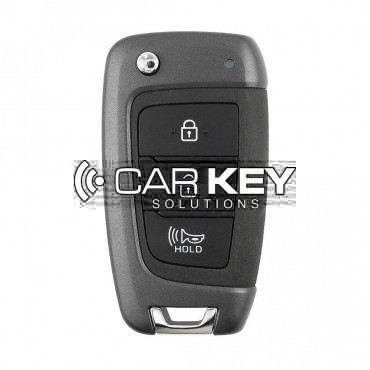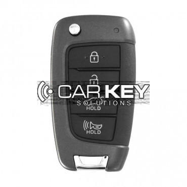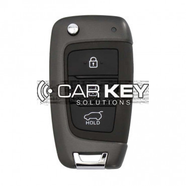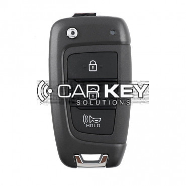 This original OEM folding remote control for the Hyundai Tucson 2022 has 3 buttons and operates at a frequency of 433 MHz. The housing color is black and the remote control does not have a panic funct..